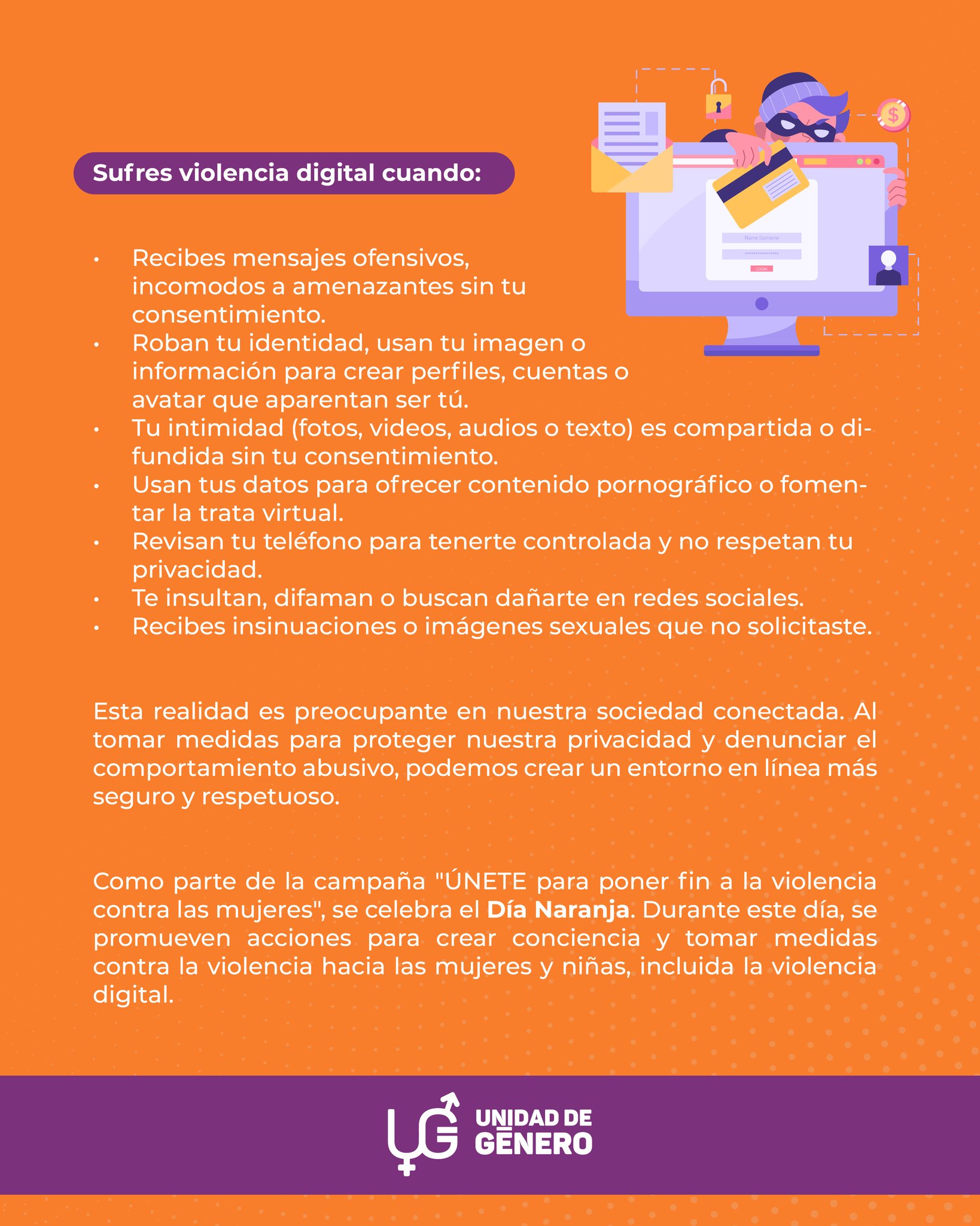 El Día Naranja, es una campaña respaldada por las Naciones Unidas, se celebra cada 25 de mes para recordar la urgencia de erradicar la violencia que afecta a millones de mujeres en todo el mundo.